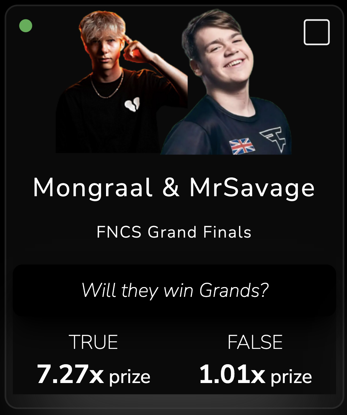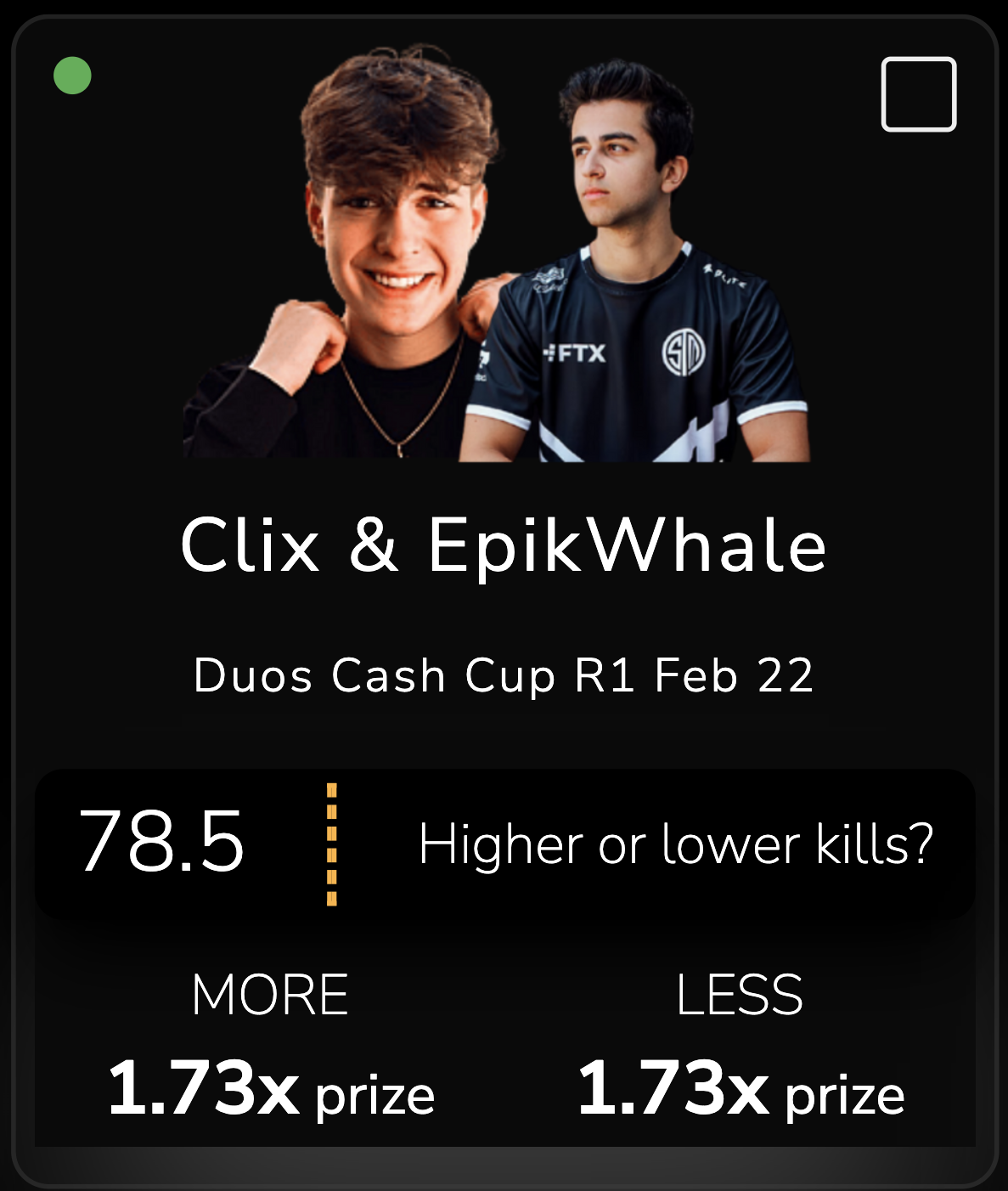 Player vs. Player: Choose which player will outperform the other in specific stats. Imagine placing a bet on Clix vs. AsianJeff, predicting who will have more eliminations.